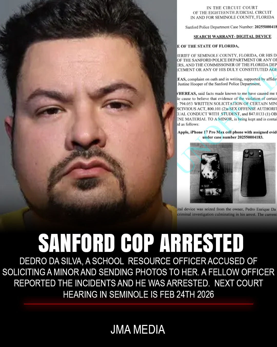 Pedro Da Silva, A Sanford, Florida Cop was arrested for attempting to solicit a juvenile at the school. A search warrant has been filed for the contents of his phone. He was fired from the agency. City of Sanford, FL Government